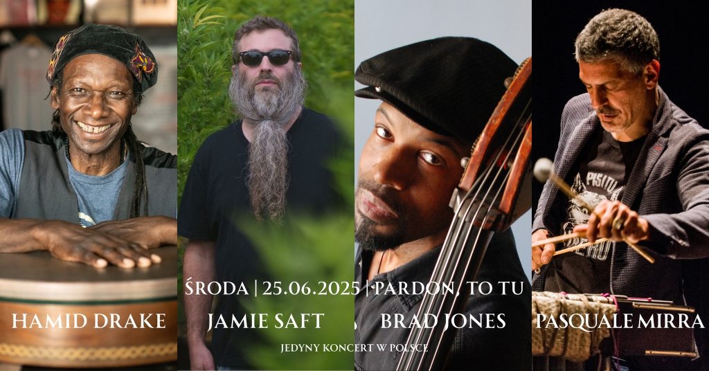 Jeden z niewątpliwie najważniejszych współczesnych perkusistów muzyki improwizowanej HAMID DRAKE wraz z jego długoletnimi współpracownikami jakimi są klawiszowiec JAMIE SAFT, kontrabasista BRAD JONES oraz włoski wibrafonista PASQUALE MIRRA wystąpią 25 czerwca 2025 w Pardon, To Tu. Będzie to ich jedyny koncert w Polsce w tym czasie. Zapraszamy bardzo serdecznie!